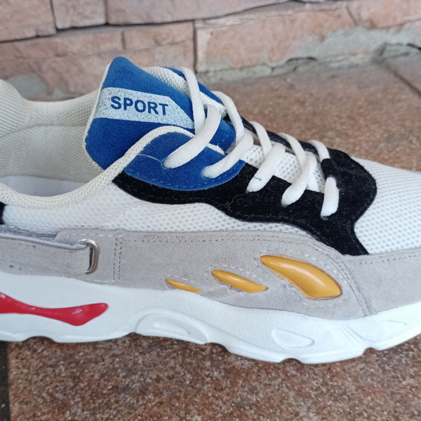 Кроссовки сетка, серый замш с красными, жёлтыми и синими вставками, на шнурках