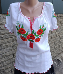Вышиванка для девочки с маками и зелёными листками рукав фонарик