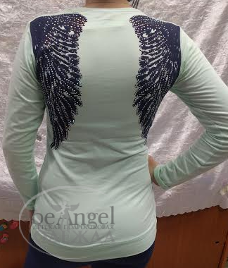 Очень удобный и лёгкий костюм для девочки из качественного турецкого трикотажа. Кофта: без застёжек, сзади большие крылья, украшены мелкими разноцветными стразиками, а спереди на груди крылья поменьше, тоже со стразами. Цвет - светлая мята. Штаны-лосины тёмно-синего цвета, зауженые снизу с заниженой талией.