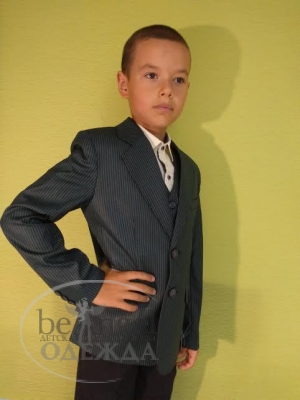 Очень удобный школьный костюм-тройка для мальчика. Брюки чёрного цвета в полосочку регулируются с помощью резинок на боках. Жилётка завязывается сзади и застёгивается на трёх пуговичках спереди. Пиджак застёгивается на пуговичках и очень хорошо садится по талии
