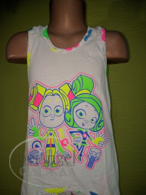 Очень яркий и красивый костюм для девочки на лето. Штаны все в ярких кислотных сердечках, выглядит очень мило. Майка-туника удлиненная по бокам и укороченная спереди и сзади. На тунике изображены фиксики в таких же ярких цветах. Такой костюм отлично подойдет и на каждый день, и на праздник. Ваша дочь будет просто неотразима. Купить такой оригинальный летний костюм можно у нас в магазине.